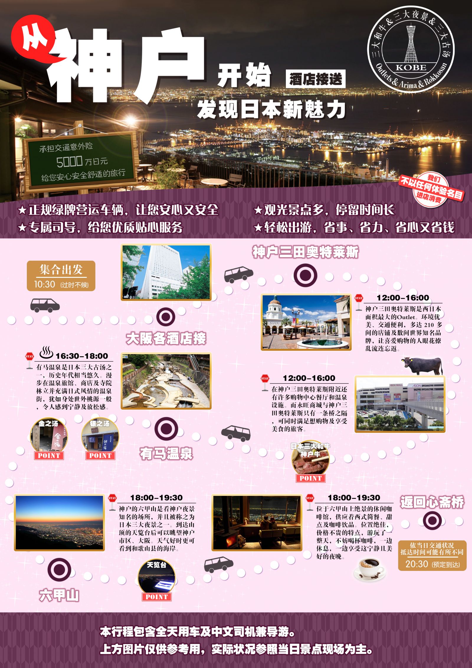 09:30~10:30大阪酒店接 → 12:00神户三田奥特莱斯 → 16:30有马温泉 → 18:00六甲山 → 20:30送大阪酒店